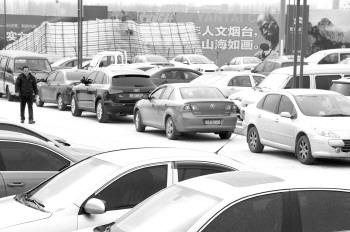 为了缓解烟台南站站前广场停车难的问题,位于广场入口处的公交车场也划出了一部分区域供社会车辆停靠。