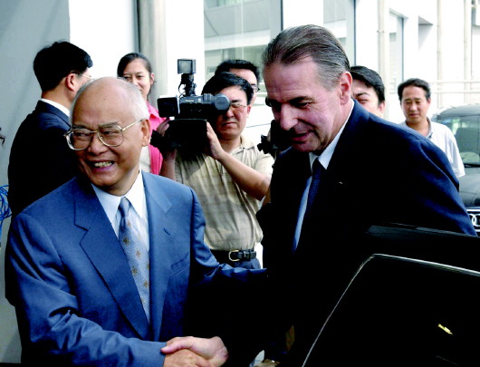 2003年8月31日,何振梁(左)在北京首都国际机场迎接时任国际奥委会主席的罗格。 新华社发