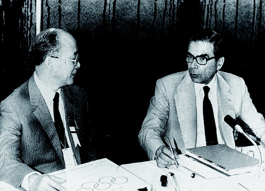 1985年6月5日,何振梁以全票当选为国际奥委会执行委员会委员。图为何振梁(左)同希腊代表菲拉雷托斯交谈。 新华社发