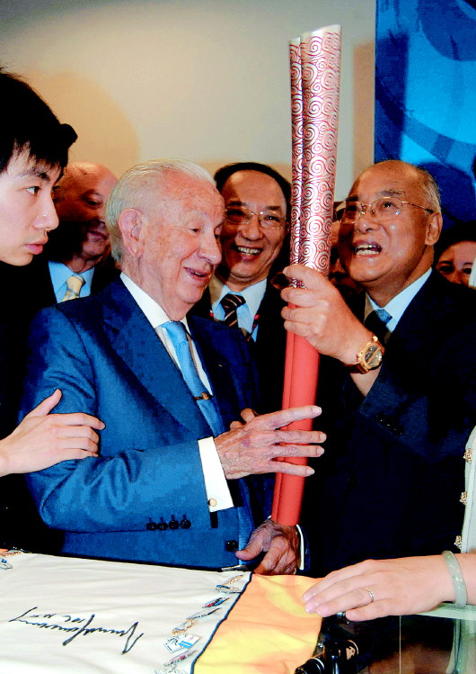 ◤2007年6月24日,何振梁(右)与萨马兰奇共同欣赏2008年奥运会火炬。