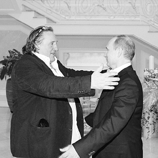 2013年1月6日,法国国宝级演员德帕迪约与俄罗斯总统普京拥抱。此前,普京下令,正式授予德帕迪约俄罗斯国籍。(资料片)