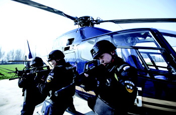 特警队员在直升飞机前严阵以待(资料图)。 本报记者 张晓科 摄