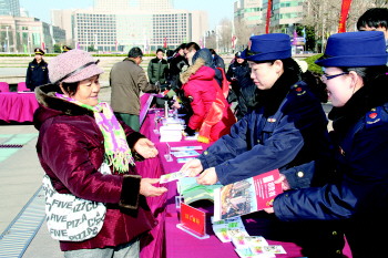 日前,市南区工商局执法人员来到五四广场,发放消费维权的宣传资料,现场受理消费者申诉和各类消费咨询。据介绍,元旦以来,各大商场促销大战拉开序幕,执法人员提醒消费者面对高折扣、高额返券等诱惑,应保持谨慎心态,谨防虚假打折,特价商品、赠品同样享受“三包”服务,购物凭证要保管好。