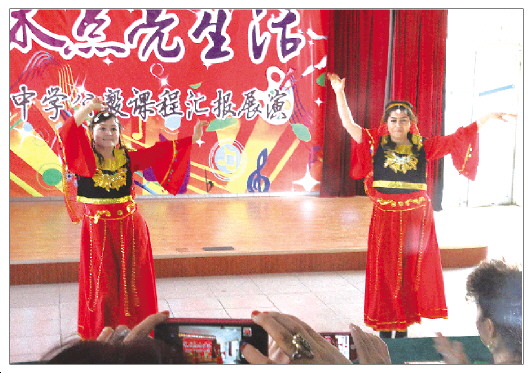 到陈毅中学顶岗培训的新疆疏勒县的老师们身着名族服装也参与进来,《我们的歌》,浑厚悠长,《喀什姑娘》,婀娜优美,赢得了全场师生的阵阵掌声,把联欢活动推向了高潮。