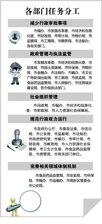 《分工方案》要求,凡市场能有效调节的一律取消审批,各区县今年要公开“三公”经费,今年一季度公布权力清单和权力运行流程,清理“红头文件”自设的非行政许可审批。