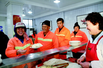 环卫工人正在领取免费早餐。 本报通讯员 韩文彬 摄