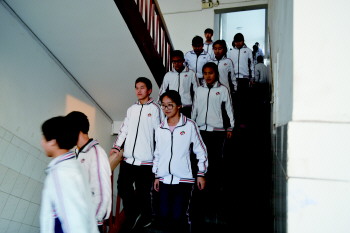 张店七中的学生在课间操时,有秩序地靠右边下楼梯。