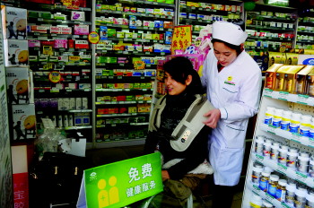 市民在漱玉平民大药房免费体验肩颈按摩仪。 实习生 李洋 摄