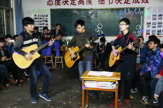 为迎接新的一年,2014年12月30日晚上,滕州一中高一、高二的各班同学汇聚一堂,举行元旦晚会。图为高一九班的同学表演拿手好戏,和同学们一起嗨。 本报记者 张冬梅 甘倩茹 摄影报道