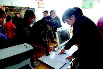 本报肥城1月6日讯(记者 刘真) 近日,在老城街道办事处月庄村,村民围在一起填表、登记、审核。原来,这是房管局“流动大篷车”进村办理农村集体土地房屋所有权证。当天,为60多户村民建立了房屋登记申请档案。