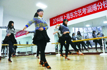 6日,不少艺考生在上海东方艺考学校淄博分校进行形体训练。据了解,今年艺考因为部分学校将考试时间推迟到了春节之后,艺考季整体时间较往年来说更短,导致部分参加艺考的学生不得不提前规划行程,通过培训学习抢占先机。 本报记者 王鸿哲 摄影报道