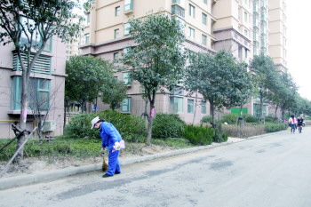 张店某小区的物业工作人员正在打扫卫生。 本报记者 刘光斌 摄