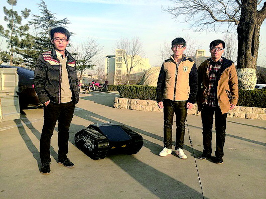 董大鹏、王礼生、邵庆然和他们研发的机器人履带式底盘。
