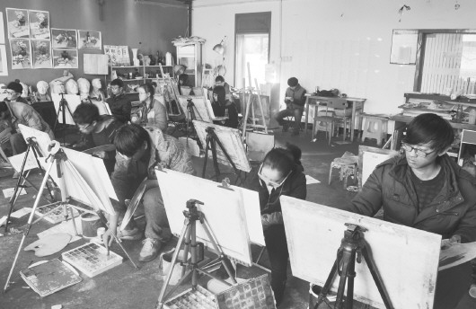 在舜日艺术教育机构的画室内,美术考生们正加紧练习。 本报记者 王光营 摄