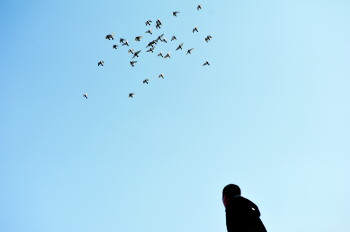 戴世斌抬头看着他养的信鸽在空中翱翔。