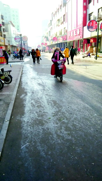 9日上午,记者来到不夜城商业街,街上北段每隔几步路面就有一摊薄冰,有些商家直接把污水泼到路中央,部分污水结冰,偶尔有行人和车辆走过。南段相对于北段来说则好了不少,只在雨水箅子周围有部分水。