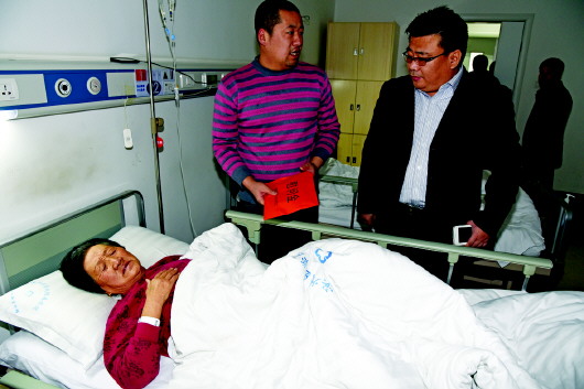 刚刚做完手术的张洪珍虚弱地躺在病床上,看到滨城区公路局领导送来的善款,她激动地流下眼泪。她的丈夫封兆祥曾是区公路局的员工,不幸的是夫妻两人都患上癌症,为了帮助这对患难夫妻,区公路局全体员工筹集善款缓解药费之急。