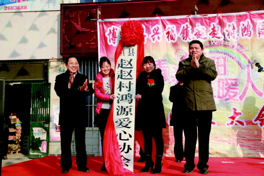 商立波(左一)和赵秀民(右一)为赵赵村鸿源爱心协会揭牌。