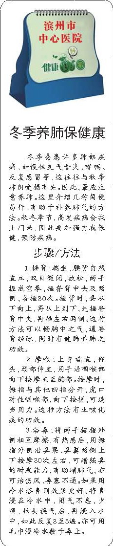 1.捶背:端坐,腰背自然直立,双目微闭,放松,两手握成空拳,捶脊背中央及两侧,各捶30次。捶背时,要从下向上,再从上到下,先捶脊背中央,再捶左右两侧。这种方法可以畅胸中之气,通脊背经脉,同时有健肺养肺之功效。