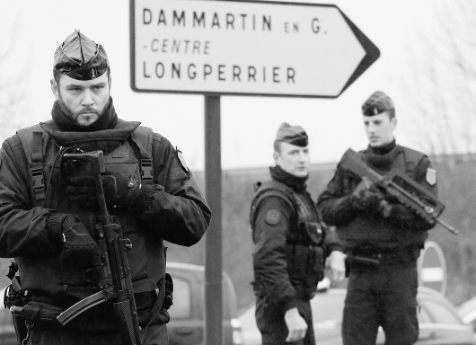 法国警方和反恐部队已封锁通往达马尔坦昂戈埃勒的所有道路,以缩小范围,围捕库阿奇兄弟。当地政府官方网站发出声明,警告居民不要出门。法国内政部发言人勃兰特说,他非常肯定两名嫌疑人在被包围的建筑中。当天早些时候,警方在一个安全检查站附近与武装人员发生激烈交火。一名女子向警方报告说,库阿奇兄弟全副武装,抢走了她的标致牌轿车。