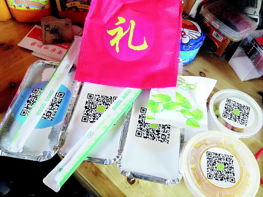 ▲商家在外卖餐盒上印制了二维码供顾客扫描。阳娇 摄