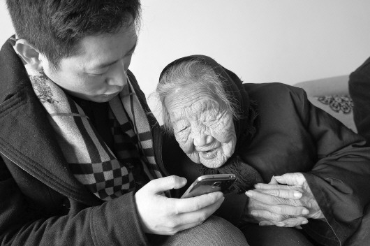 老人对现代化的电子产品挺有兴趣,和曾孙一起看手机上的新奇玩意。