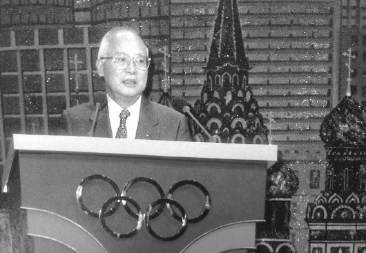 何振梁在2001年进行申奥的最后陈述。 (资料片)