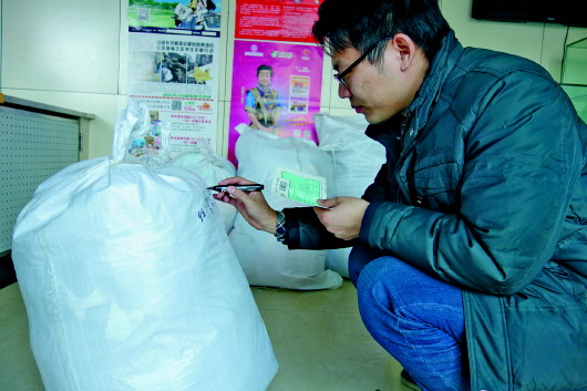 本报工作人员在包裹上认真填写邮寄地址。本报记者 肖龙凤 摄