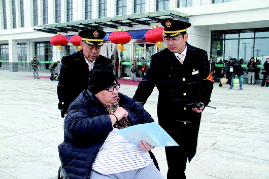 青荣城际铁路开通运营后,烟台车务段烟台南站干部职工元旦前夕冒着风雪热心照顾重点旅客。(张广亮 摄)