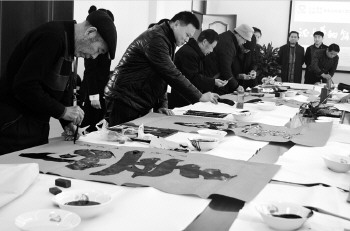 10日,心心酒业与任城区民政局、任城区书法家协会联合举办“新春送祝福”大型文化敬老活动。来自任城区书协、“圣地七子”书法团队的书法家们,挥毫淋墨,现场书写“福”“寿”及春联,倡导敬老爱老。 本报记者 于伟 摄