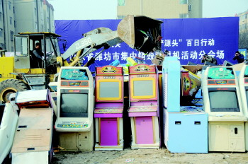 本报1月11日讯(记者 赵磊 王琳)1月9日,山东省公安厅组织全省公安机关同时开展集中销毁赌博机活动,潍坊设立分会场,对近期收缴的赌博机进行集中销毁。上午10点,在福寿街北胡住村附近的一处空地上,120余台各式各样的赌博机摆放在一起,最终被铲车拍碎销毁,这些是潍坊市公安局2014年10月份以来查获扣押收缴的具有赌博功能的电子游戏机。
