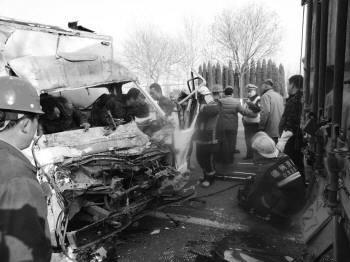 8日14时许,平原县桃园大道附近发生一起交通事故,一辆厢式货车追尾撞在前面一辆大货车尾部,挡风玻璃全部破碎,2人被困在厢式货车驾驶室内,消防队员利用扩张器扩开车门,最终将两人救出。目前,事故具体原因正在调查之中。 本报记者 孙婷婷 通讯员 杜长青 摄影报道