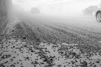 1月11日,在南部城区105国道下穿铁路桥下,路面上洒满厚厚的砂石,车辆经过扬起浓重的沙尘,影响司机的视线,存在安全隐患。 本报记者 马志勇 摄