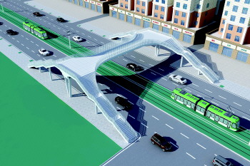 据介绍,有轨电车运营线路中,青岛农业大学门口路段人口最为密集,为保障市民过街安全,此处建设一条过街天桥。从效果图看,在建过街天桥横跨马路两侧,高度高出轨道电网,整体呈“工”字型,有4个上下口,楼体层级较多,各台阶坡度较小,方便行人行走。