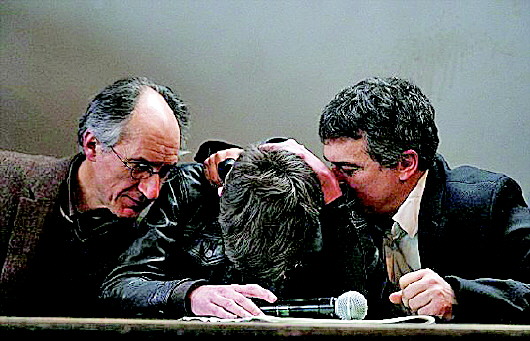 《沙尔利周刊》新封面主笔(中)在13日举行的发布会上阐释自己的创作理念时失声痛哭。据中国日报
