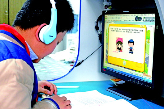 13日下午,十亩园小学的四年级学生正在学校进行英语口语网络测试。 本报记者 李飞 摄