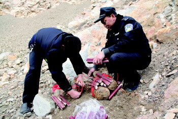 随后,民警将这些炸弹安置在废弃矿坑内一个深坑中,分成两部分引爆,并且缠绕引线放置了46公斤的炸药用于引爆。“这些废旧炮弹需要引爆才能进行销毁,但是意外情况也有引爆的危险。”民警告诉记者,这些炸弹很多都是在旧村改造和建筑工地施工过程中发现的,因为仍然有爆炸的可能,所以这些东西流落在外很容易引起危险。