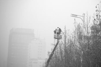 1月14日,天衢路上,路灯管理工作人员在雾霾中检修路灯设施。当日,受雾霾天气影响,德州市区能见度排名全省垫底。 本报记者 马志勇 摄