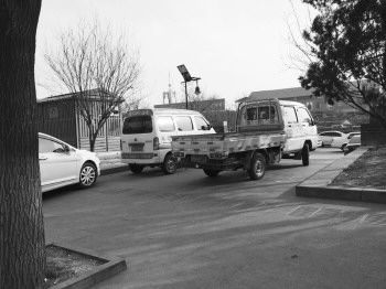 东方红路与解放大道路口邻近步行街、观湖城等商业区,泊车压力巨大。13日,一辆小型货车正好堵在路口,影响车辆通行。 本报记者 张磊 摄