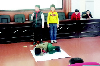 日前,青岛鞍山二路小学联系学生日常生活,开展了防踩踏专项教育活动,开启寒假前安全教育系列课程。图为学生演示跌倒后,要手抱头,膝前屈,侧躺等自救自护的安全知识。