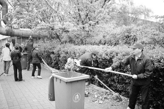 ▲去年4月份,济南的志愿者正在对道路两边的绿化带进行清扫。(资料片)