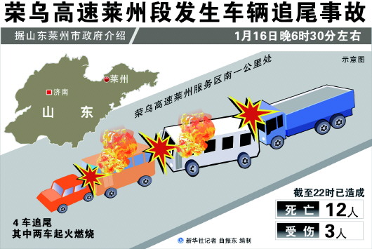本报烟台1月16日讯(记者 李大鹏) 16日晚6时30分左右,荣乌高速莱州服务区南一公里处发生4车追尾相撞交通事故,截至22时,事故已造成12人死亡、3人受伤。