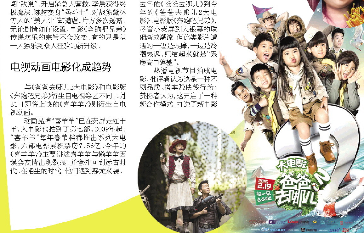 被称为“四天半速成”、“最不像电影的电影”的《爸爸去哪儿》,去年贺岁档七天票房接近5亿元成为黑马,也是近年来荧屏综艺节目逆袭大银幕的成功典范。这个贺岁档,多部从荧屏衍生出来的大电影确定档期,包括《爸爸去哪儿2大电影》、电影版《奔跑吧兄弟》以及《喜羊羊7》。小荧屏逆袭大银幕,俨然已成潮流。