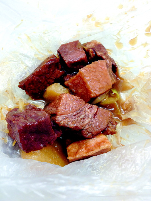 随后,老板从食料盒里盛出几块牛肉,牛肉被切成块状后颜色发暗,纤维也比较粗,入口后会觉得很咸。