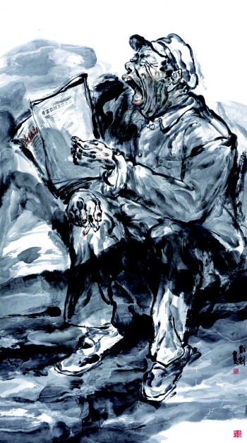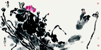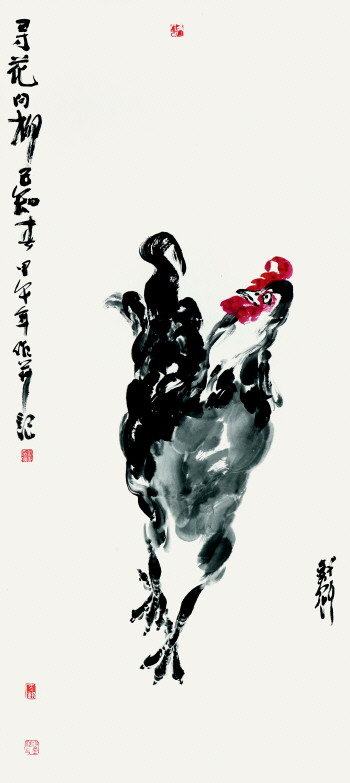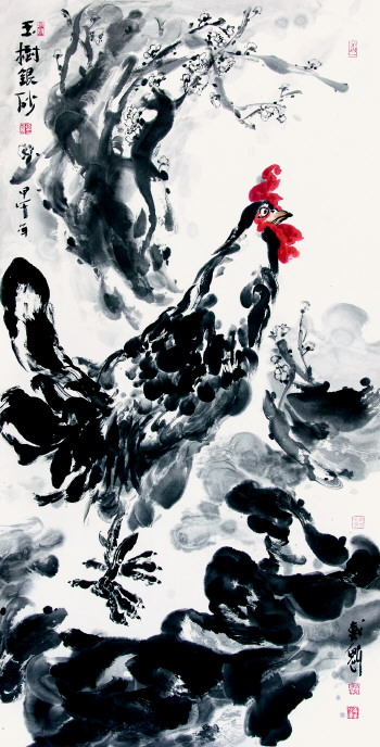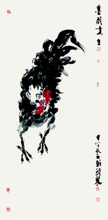 戴魁原本以人物画为主,兼涉花鸟画,两者虽然有别,但相得益彰。近年他的人物画,一改具象写实的规范,以当代艺术的新视觉,弃貌离形,意态兼包,其笔下人物神化自若,情境超然,颇受好评。而我对于他的人物画及花鸟画比较而言,我尤看重他的花鸟画,他对画面的置陈布势,如“萦回崖谷,任于造化”,展现新、奇、险的图式,其中所置或荷、或鸟、或鸭、或鸡形态天真烂漫,风骨纵逸,由实象蜕化而出的意象,体现着时代特征,也显示出画家胆敬独造的艺术匠心。在笔墨发挥上,不受物形物态所拘,其大笔用墨或细笔勾勒,构成圆融浩溅的气局里,突显的作品意韵,若“清涧长源,流而无限”。使我想到古人论及对苏东坡的“一唱三叹”的赞美,我以为“唱”易而“叹”难,且又是三“叹”,而“唱”是心声,“叹”是心境。那种多层次的意韵,随之显现的心灵幻化的神采,诗人、书家、画家都会出现相仿佛情境,对此古有成说。明代倪赞《倪氏杂记笔法》云:书至“无古无今无人无我,写固不休,到熟极处忽然悟门大启,层层透人,洞见古人精奥,我之笔底尽出天机”,至“不缚无脱之境”。这就是艺术大家超凡脱俗的文化品性,以及心灵神慧营造的境界,在宇宙与大地之间,呈现着他的灵魂密码。