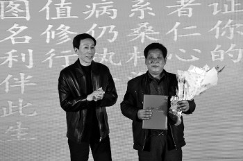 段向阳(左)为刘庆民颁奖。本报记者 李岩松 摄