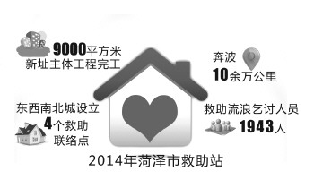 2014年,菏泽市救助管理站工作人员一如既往地奔波在救助流浪乞讨人员的路上,全年共救助流浪乞讨人员1943人,送救助人员返乡奔波行程10余万公里。除此之外,占地面积9000平方米的菏泽救助管理站新址主体工程完工,同时救助管理站在东城、西城、南城以及北城办事处设立了“救助联络点”,是全省救助工作亮点工程。
