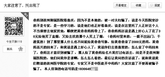 14日,滨州贴吧上一网名为“今生不换119”的网友的帖子引发关注。帖子中写到,自己的父母不常出远门,从外地赶到滨州医学院附属医院看鼻窦炎时,被一对夫妇以“今天医院坐诊的不是专家,但可以直接去专家家中”为由带到了别的地方就诊。该网友表示:“爸妈到了那里,那人什么也不问就给我爸爸号脉,给我爸爸拿了2000元的药,我爸妈高兴地回来了,和我说是遇上好心人了,我说你们去查鼻窦的,怎么拿了中药回来了,爸妈这才意识到被骗了。”