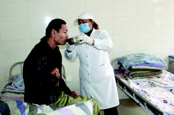 工作人员给从小就患有小儿麻痹的病人喂水。 实习生 李洋 摄