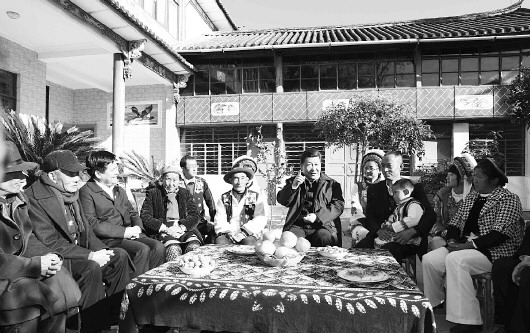 据新华社“新华视点”微博报道,19日,习近平新年首次离京考察,选在云南鲁甸地震灾区。20日上午,习近平又来到云南洱海边的湾桥镇古生村,他叮嘱当地干部一定要改善好洱海水质。当来到一家七口“四代同堂”的村民李德昌家时,习近平说:“这里环境整洁,又保持着古朴形态,这样的庭院比西式洋房好,记得住乡愁。”还说,羡慕当地人生活,舍不得离开。 新华社发